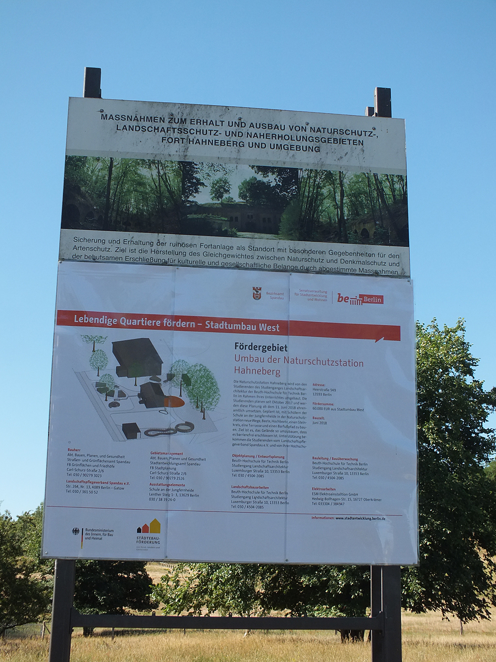 Das Bauschild Heerstraße mit neuem Bauschild zum Umbau der Naturschutzstation Hahneberg des Landschaftspflegeverbandes (LPV) Spandau, 3. Juli 2018
