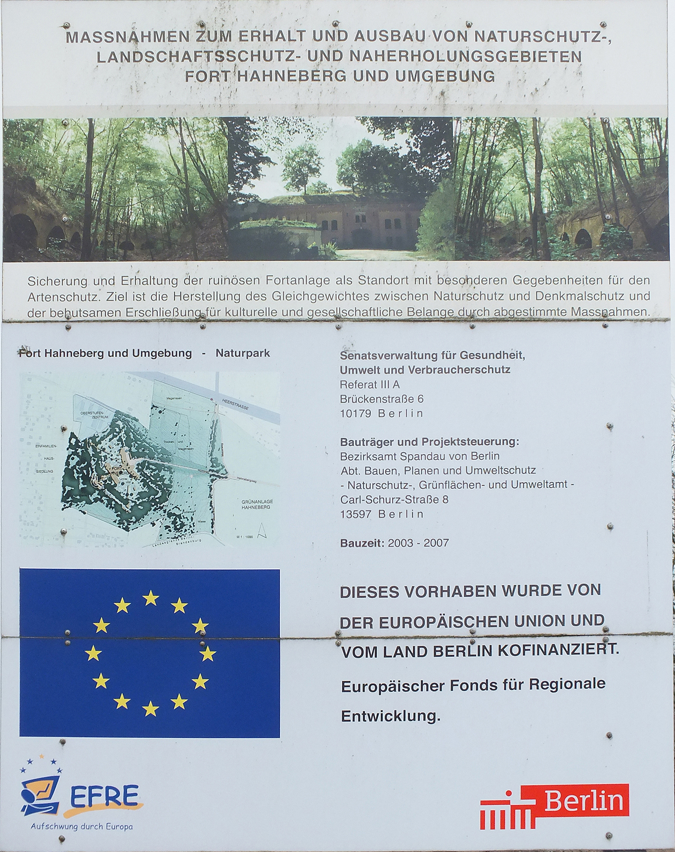 Bauschild zu den Arbeiten für das Naturschietzgebiet Fort Hahneberg, aufgestellt im Januar 2004, März 2015