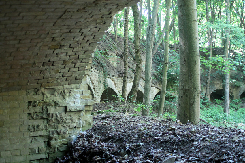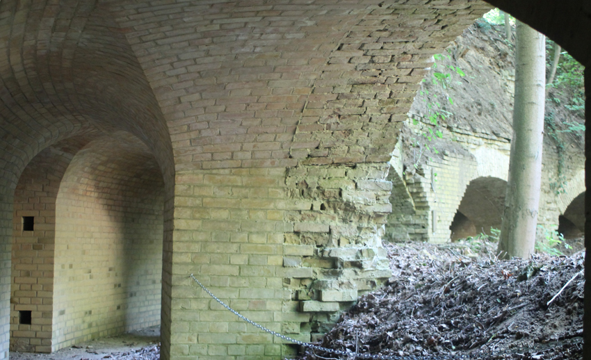 Ein weiterer Schritt im Zuge der Sicherungsmaßnahmen ist getan: das Minenvorhaus ist nun wieder begehbar! Die Vereinsmitglieder haben ein Schutzdach am Eingangsbereich gebaut, damit der Zutritt in das Minenvorhaus vor eventuell herunterfallenden Ziegeln gesichert ist. Die Bögen wurden mit Ketten abgesichert. Geniessen Sie nach über vier Jahren Sperrung nun endlich wieder einen Blick auf die Spitzgrabenwehr, die selber noch nicht wieder begehbar ist.